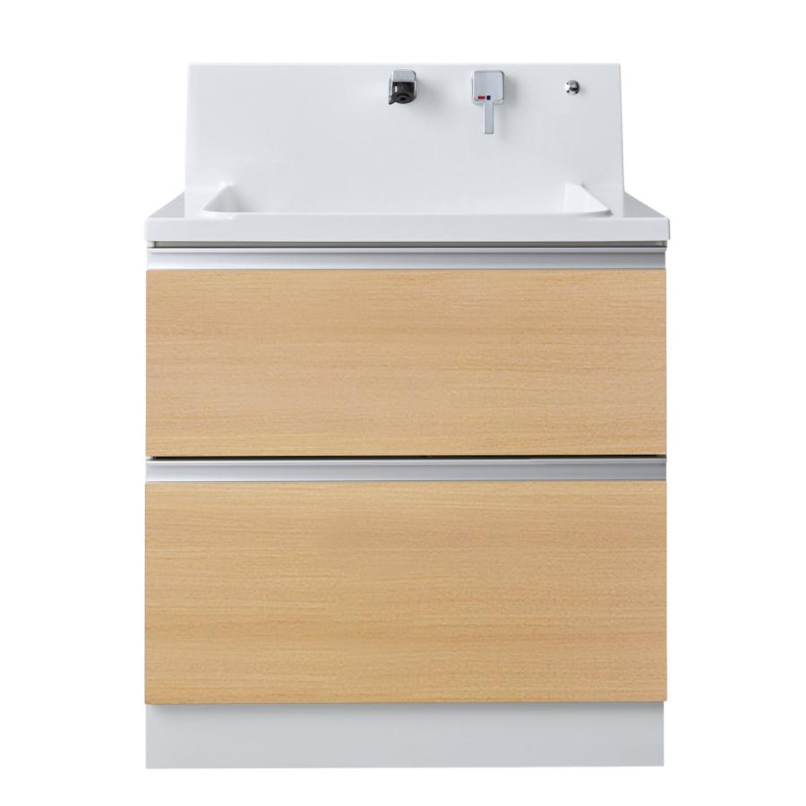 スタイリッシュな形状に、使いやすさの工夫が詰まった洗面化粧台です。※ミラーおよび水栓は別売となります。